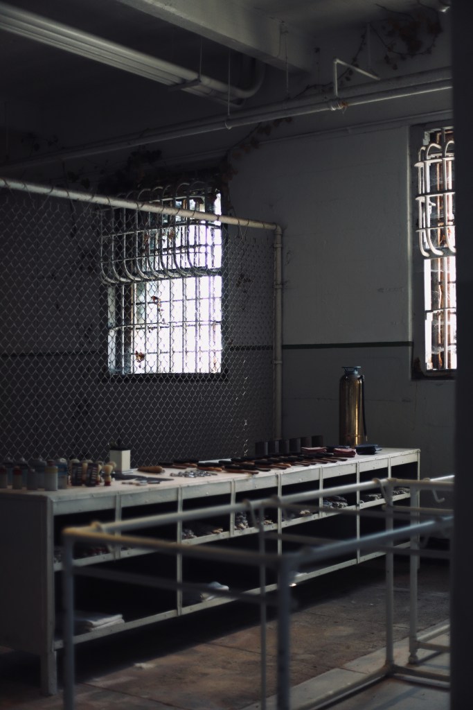 At the end of the live tour, we went inside the prison building for the audio tour. I opted to take a French audio tour, and my headphones were kind of gross so I didn’t wear them, but held them close to my ear. We lined up for our audio guides in an area that was the shower area, with which there was no privacy for the inmates because the guards would have wanted to keep watch of them. On one side of the showering area was this shoemaking-looking area, which I have taken a photo of here: