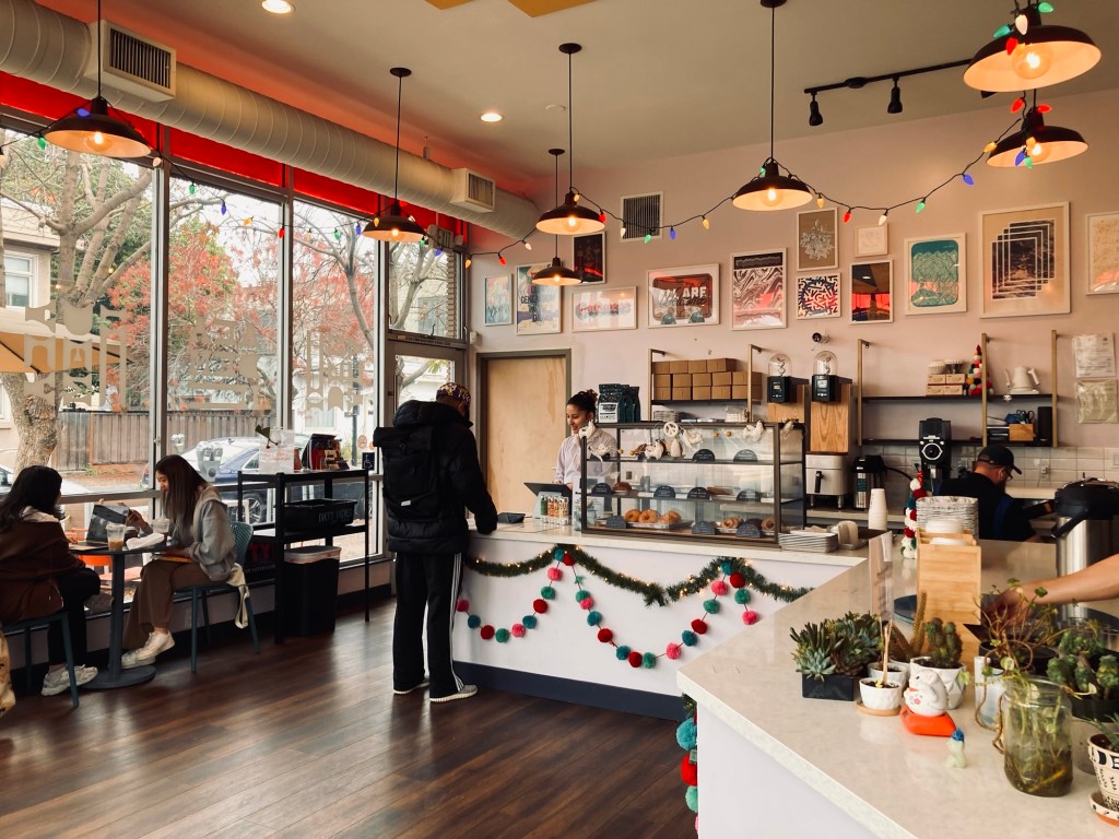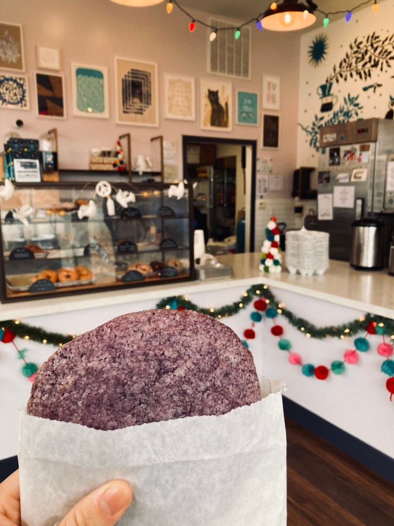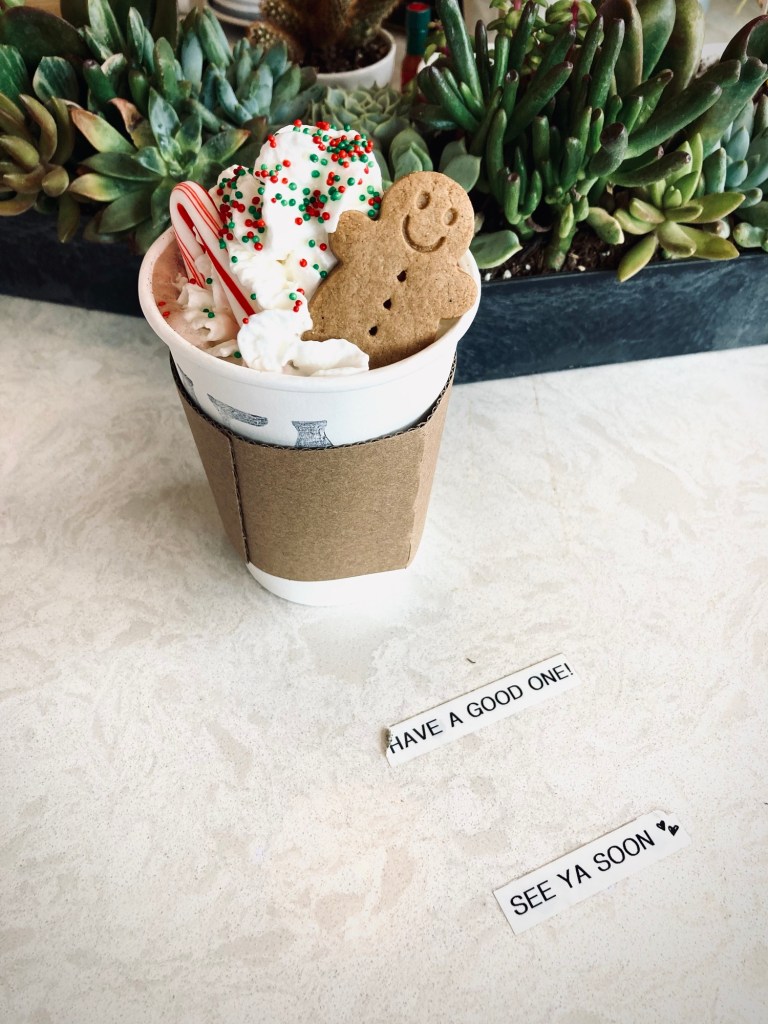Visiting a local coffee shop to try their very cute hot chocolate and their ube coconut snickerdoodle cookie: