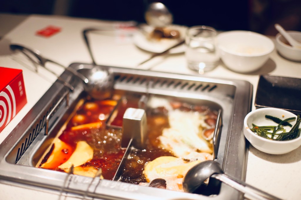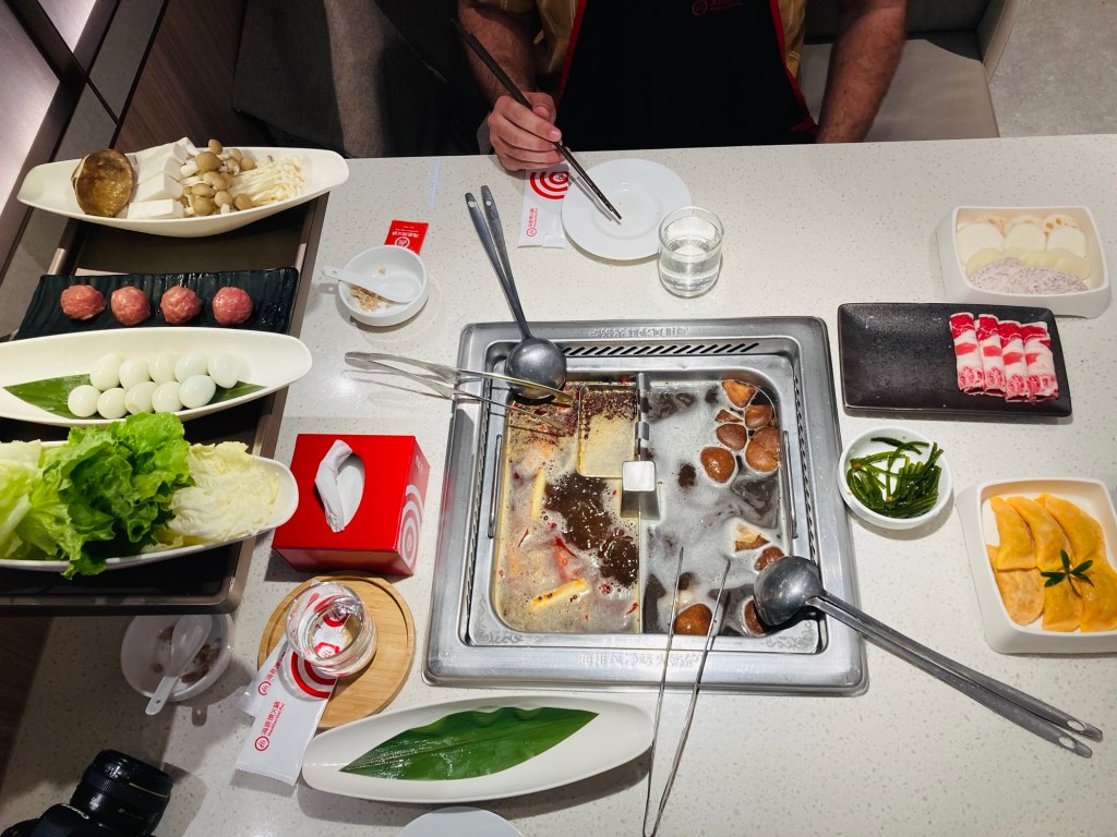 For our very late lunch (3:00 pm ish), we went to Hai di lao hot pot ! It was very yummy – Jacob got a spicy beef tallow broth and I got a mushroom broth: