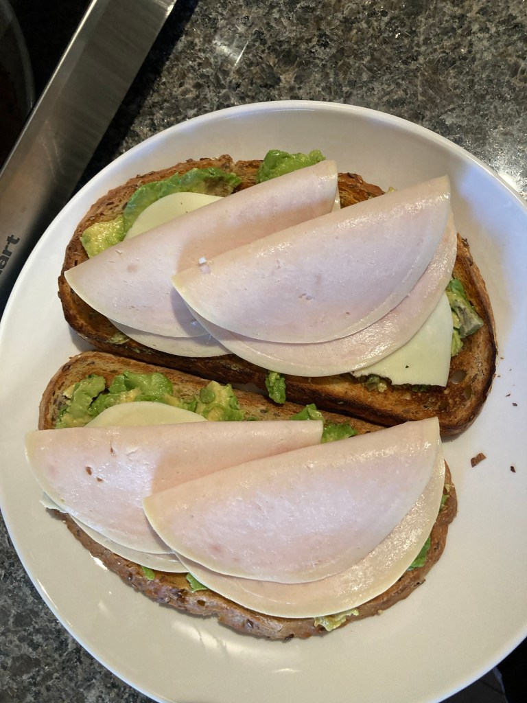 … breaking my pescatarianism after six years ! For the time being, I am only eating humanely raised meat. I have thought about reincorporating meat into my diet for a couple of years now, but I finally have done it after getting married. I first became pescatarian due to health reasons, and so because of that, I’m still going to be careful and picky about the meat I ate, mainly eating the meat at home because (1) I know where I’m buying it from and (2) I know how I am cooking/preparing it. I also already don’t like the texture of some meats, so that takes some meat out of the picture. In any case, here is a sandwich I was preparing with turkey sandwich meat that cost $1 a slice. I have avocado as the spread and also some cheese, salt, and pepper (aside from the bread):