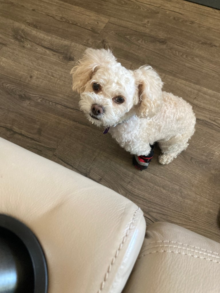 Hanging out with JJ (he licks his paw a lot so my dad put a dog shoe over his paw):