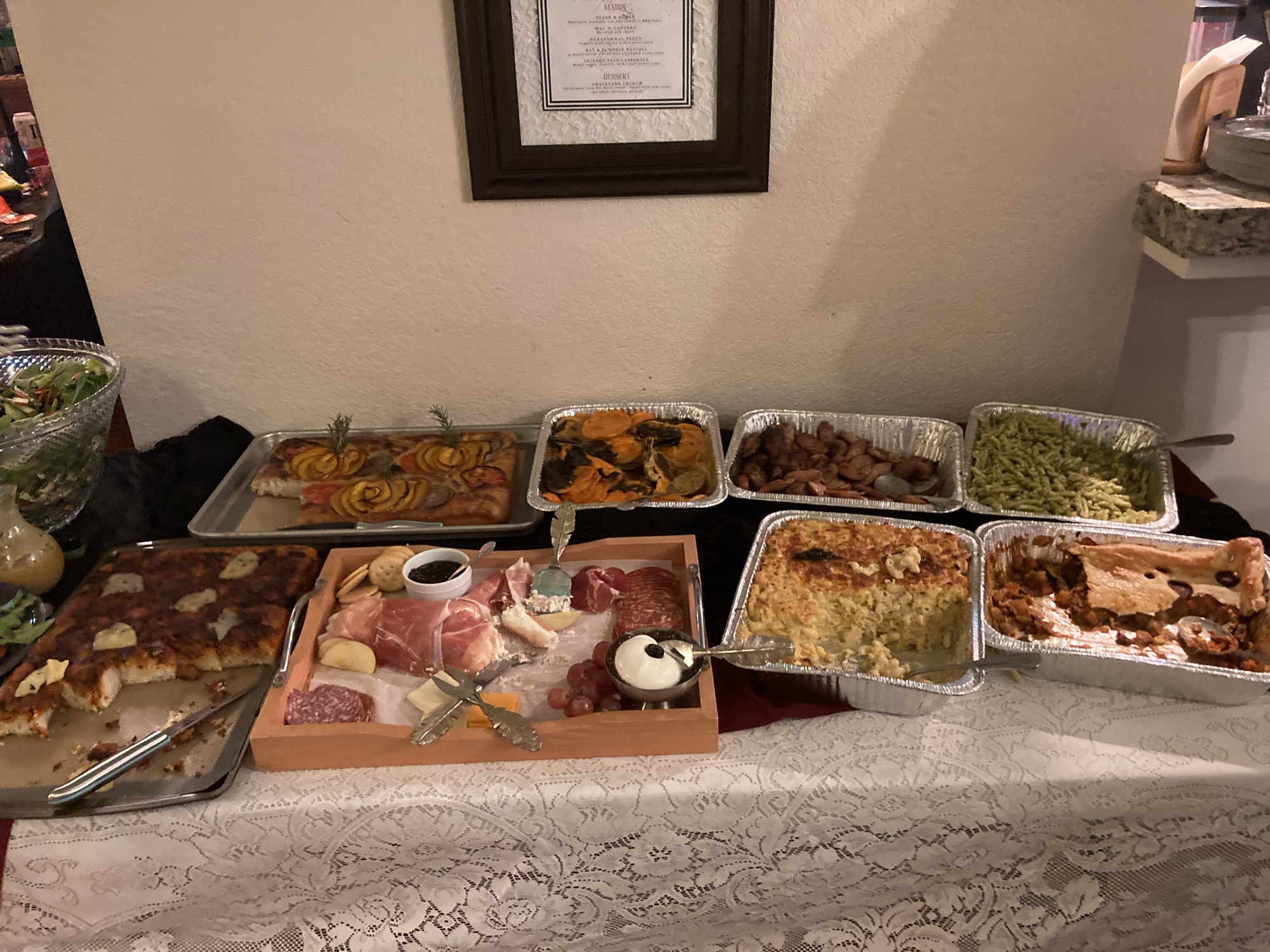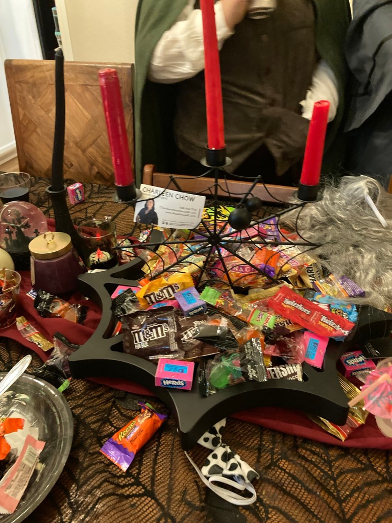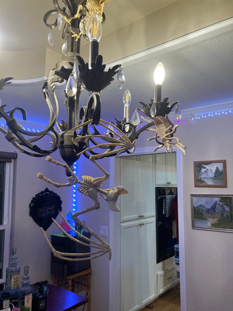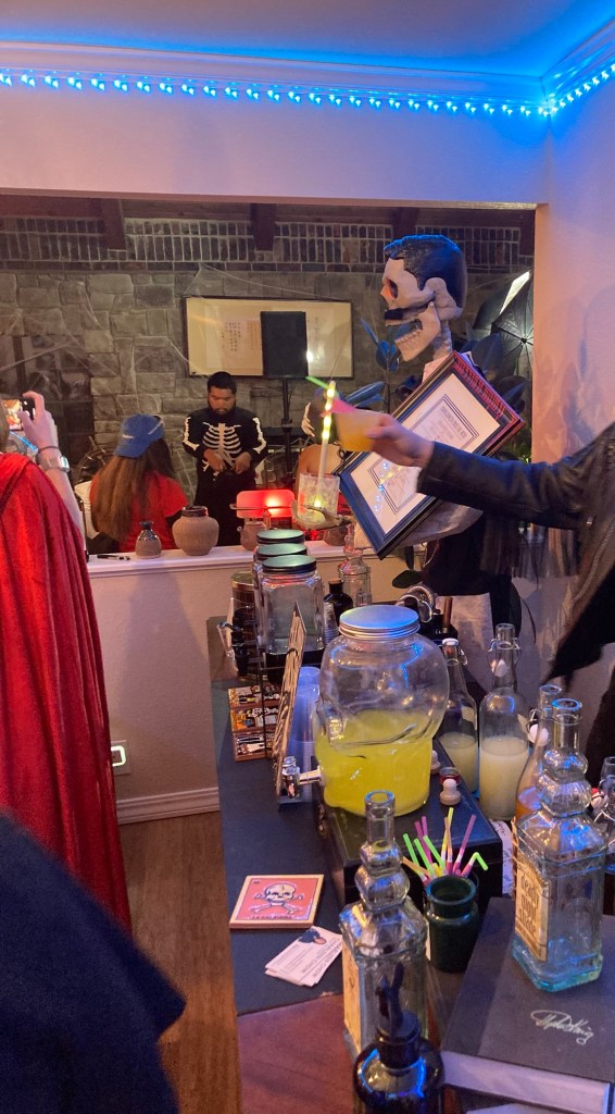 One of the sister’s husband likes to bartend ! So this is his spooky little bartending area with a skeleton assistant: