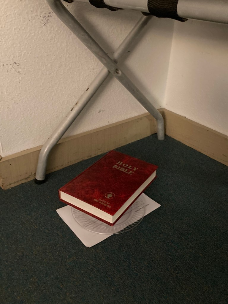At night, we also found a big ol’, fat tick on me. Thankfully, after doing a full body check, we did not find any tick bites. But I also did not want to catch-and-release this potentially lime disease-giving bug. So we had it in a cup for the time being, with the Gideon Bible as a weight over it as we decided how to get rid of it (I eventually found a plastic bag so I put the tick in there and threw it away.. I would have loved to flush it down the toilet, but all the toilets there spit up so much water when flushing, and I didn’t want the tick to fly out during flushing):