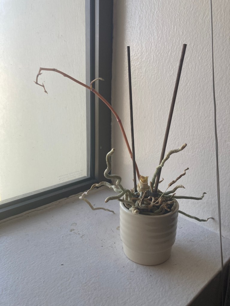 …my orchid at work finally dying… it was literally beautiful and vibrant just 3 days before, and then all of a sudden it died with all the flower petals on the counter. I eventually found and killed a moth nearby who was likely the perpetrator:
