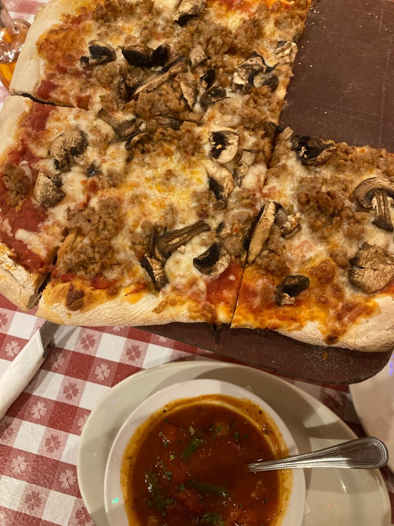 …having Jacob try to Buca di Beppo for the first time. Unfortunately I had read wrong that there were single-sized portions for the weekends (those are only for weekday lunches). We ordered a pizza but realized that the pizza was quite small… so then we ordered an additional salad (I also had ordered a soup):