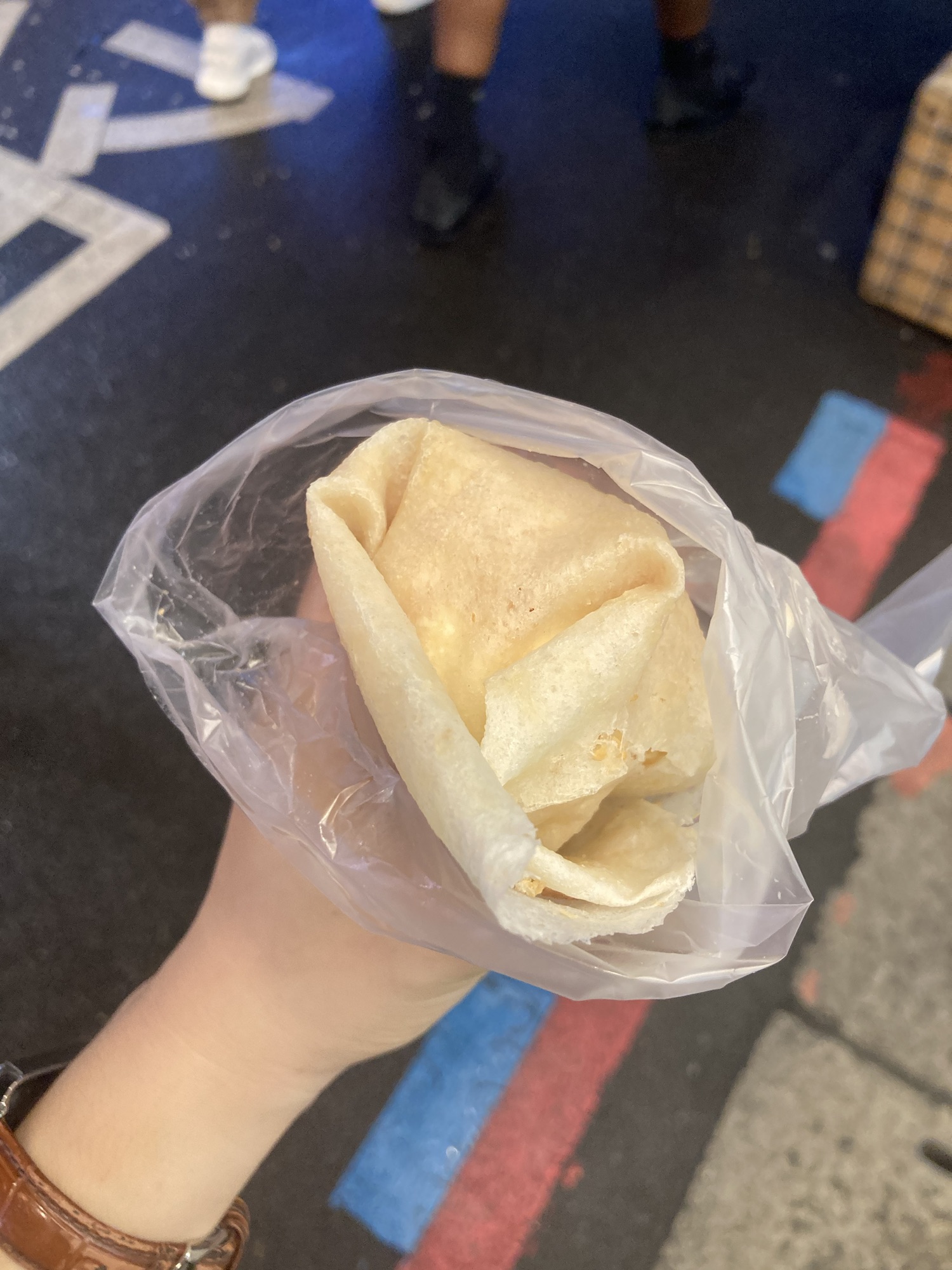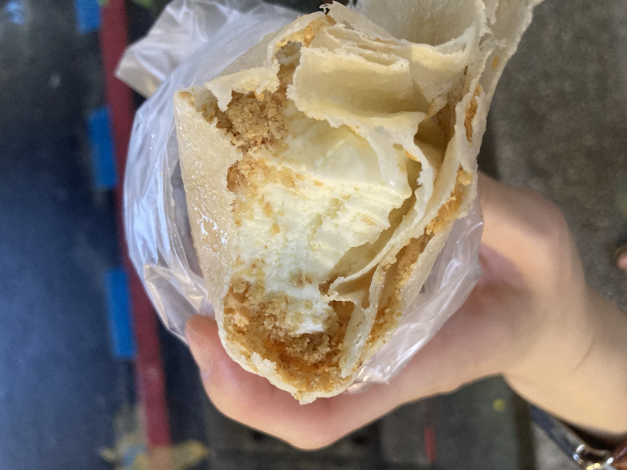 When I got back to the city, even though I was tired, since I was near the red metro line, I decided to revisit two places on the red line – 淡水 and 士林夜市。淡水 is all the way at the END of the red line, and for some reason it was making me really nauseous getting there. In any case, there was a store I wanted to visit and I wanted to get there before it closed, so that was my first stop on the red line. I got this keychain that looked like JJ, and this specific postcard design that I really liked that I haven’t seen in any other bookstore or souvenir shops. I successfully got those items, and headed back south to 士林夜市 specifically for a peanut ice cream roll – something else I haven’t seen at any other night markets. I got one at the first stall I saw, and since I couldn’t eat it on the metro, I decided to walk around. I also got to finally play the taiko drum arcade game which is probably my favorite one at this point. Here are photos of my peanut ice cream burrito: