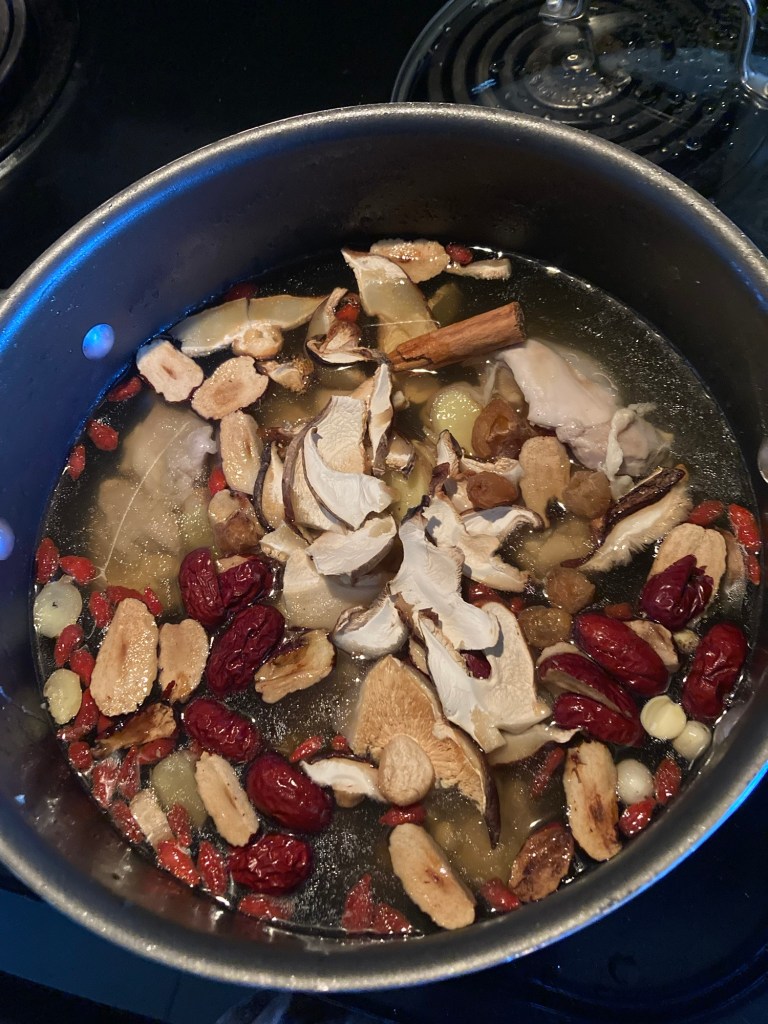 …making my own herbal Chinese chicken soup for my terrible cramping. I will probably start to make these conistently a couple weeks before my period starts to see if it makes any difference: