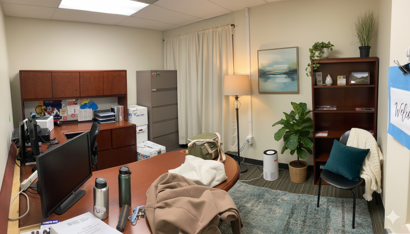 …using AI to make a temporary office room be more conducive to conducting therapy sessions. The first one is the actual photo and the 2nd one is AI-generated. The third one is what the room actually currently looks like.