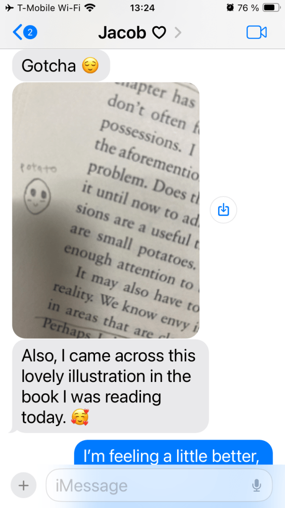 …Jacob sending me a silly photo of a drawing I did in a book I finished reading (that he is now reading):