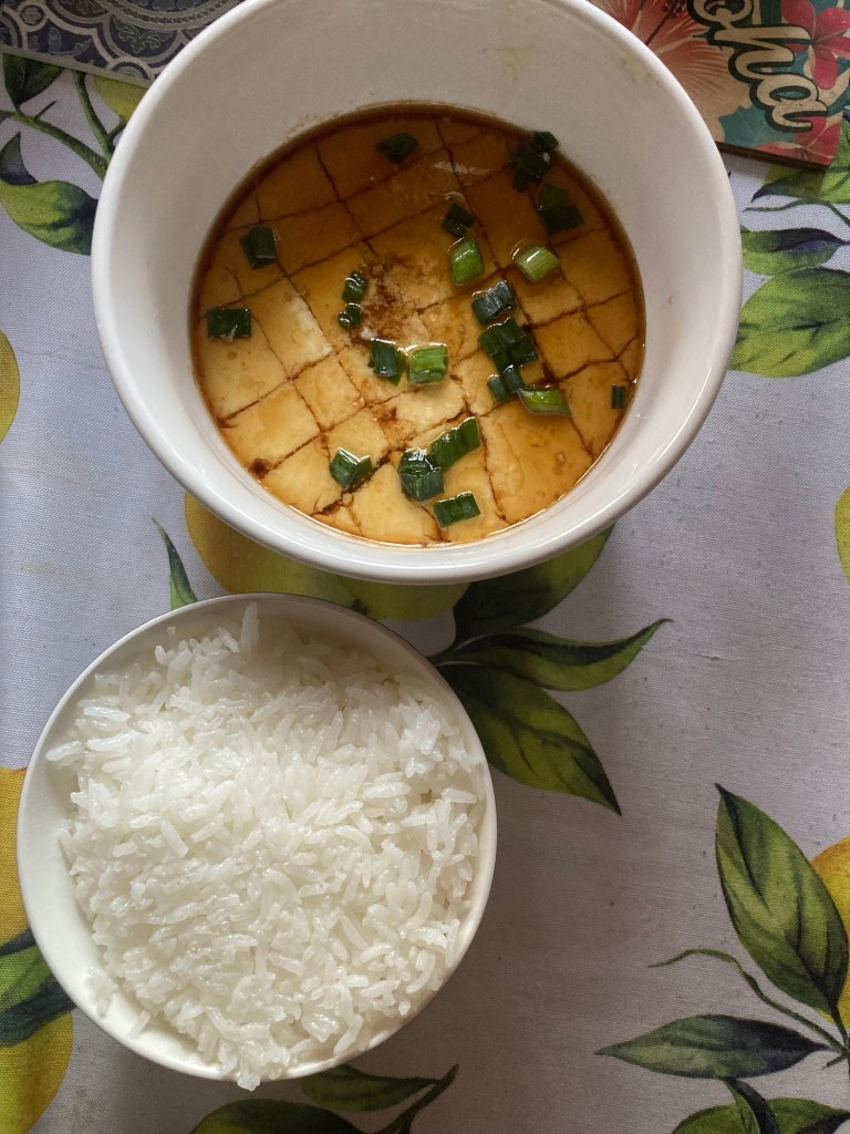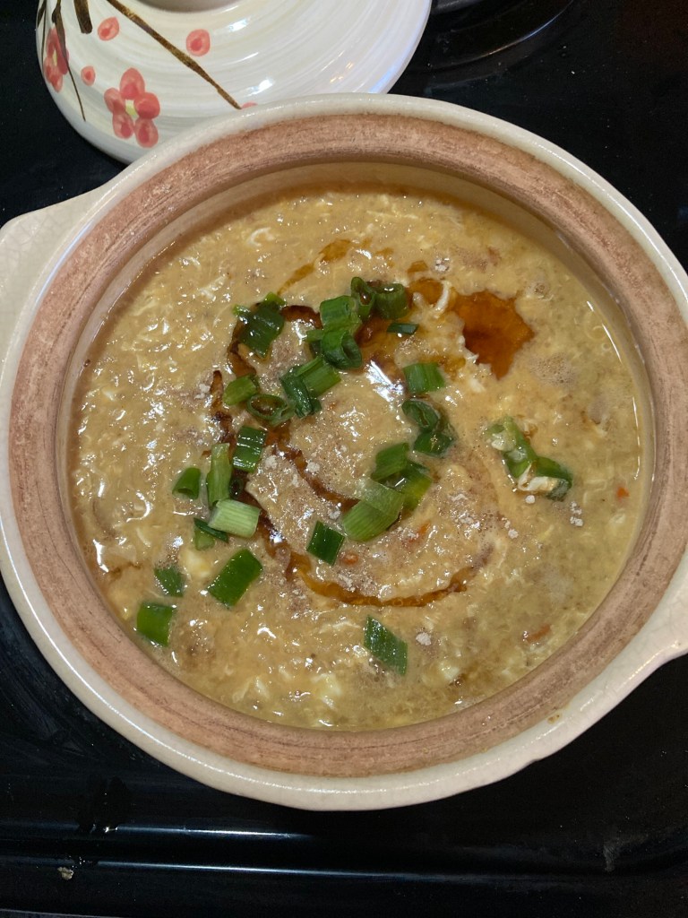 …eating lots of warm stuff, including this congee with eggs, sesmae oil, green onions, and coconut aminos: