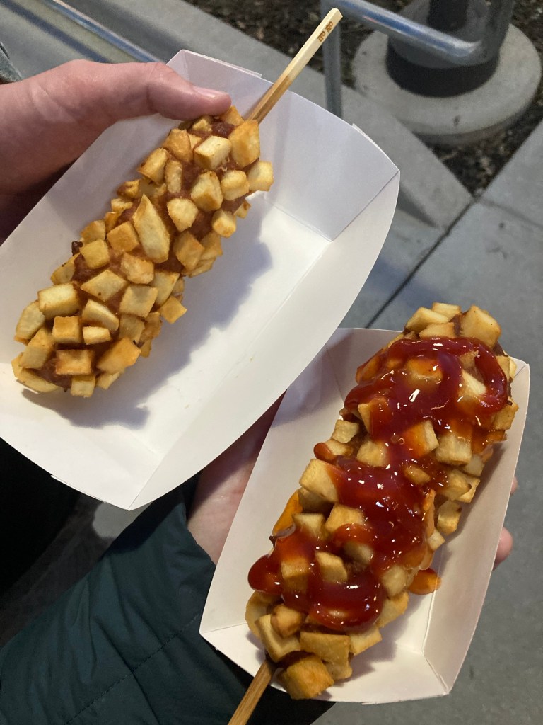 …getting more yummy Korean corn dogs. Jacob and I both wanted to try the potato one, which was like little stubs of fries and was tasty, but I feel like it overpowered the taste of the actual corn dog, so I probably won’t get the potato add-on again: